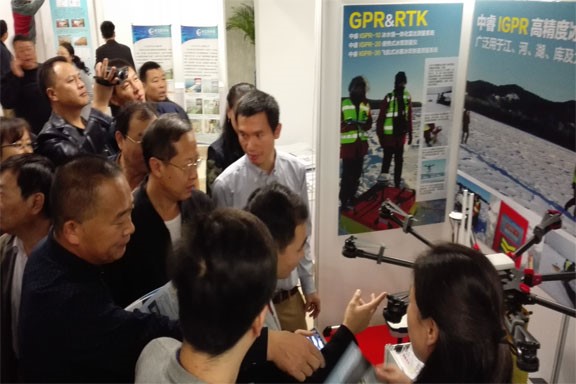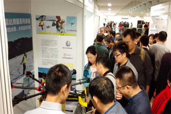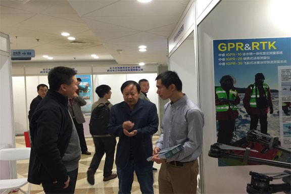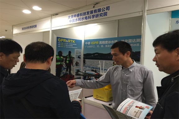 新技術成果裝備展示會場內,大連中睿科技發展有限公和中國水利水電科學研究院的聯合展位上,展出的冰水一體化雷達、無人機飛航測冰雷達和便攜式測冰雷達儀吸引了眾多與會代表參觀了解,詢問設備性能和技術指標,大連中??萍及l展有限公司副總經理、陳潔博士熱情的為與會專家和代表做了詳細介紹和說明。